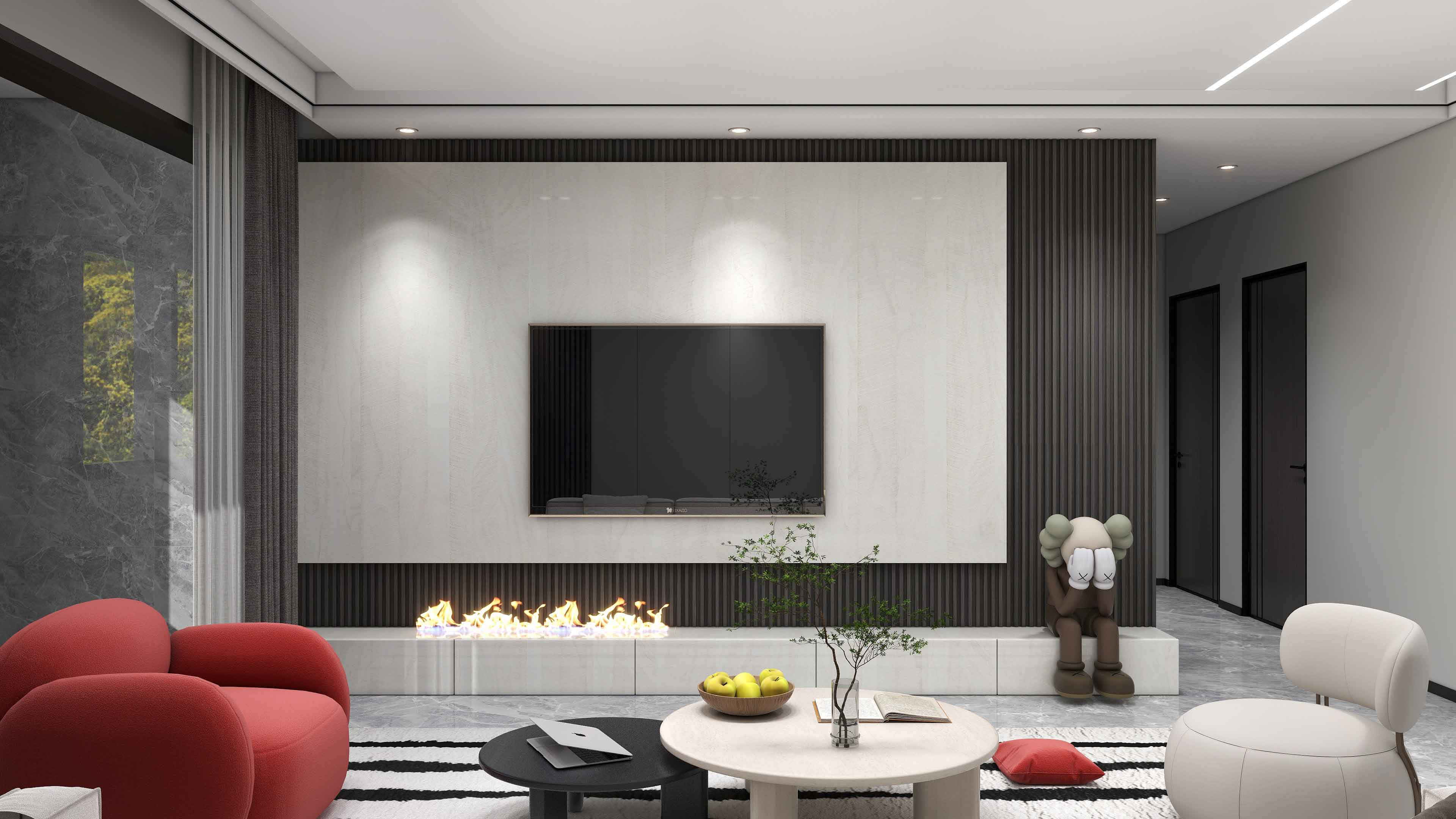 电视背景墙嵌入壁炉,为整个客厅添加温馨感烟火气,使用岩板更显高级,地台电视柜上方摆放玩偶增加趣味性。