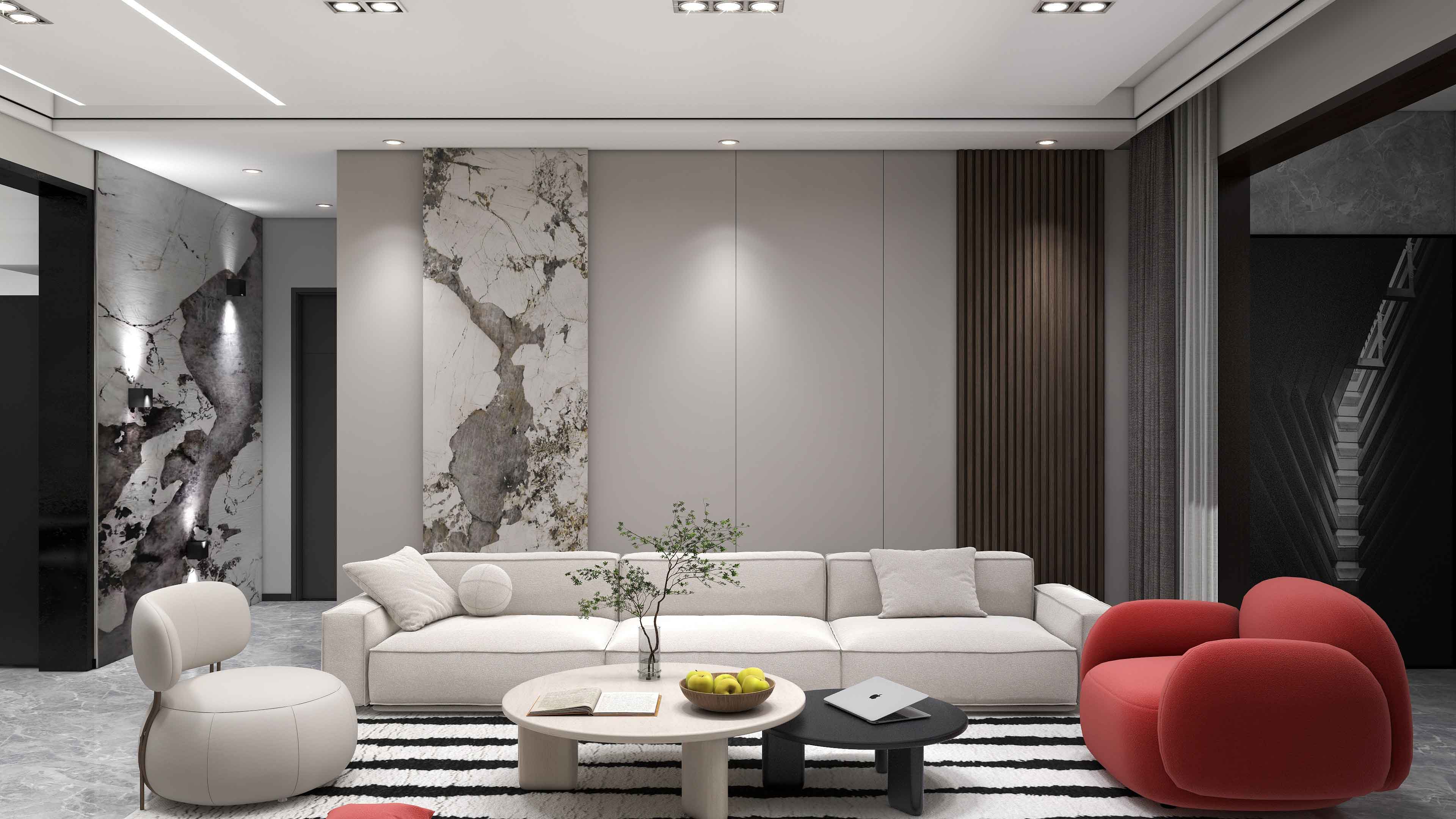 以黑色白色为主色调,空间中的中国红沙发成为空间的整体提亮及焦点,顶面采用无主灯设计,顶面干净整洁,重点照明和氛围灯光全部具备,在需要的时候可以变为家庭影音室。