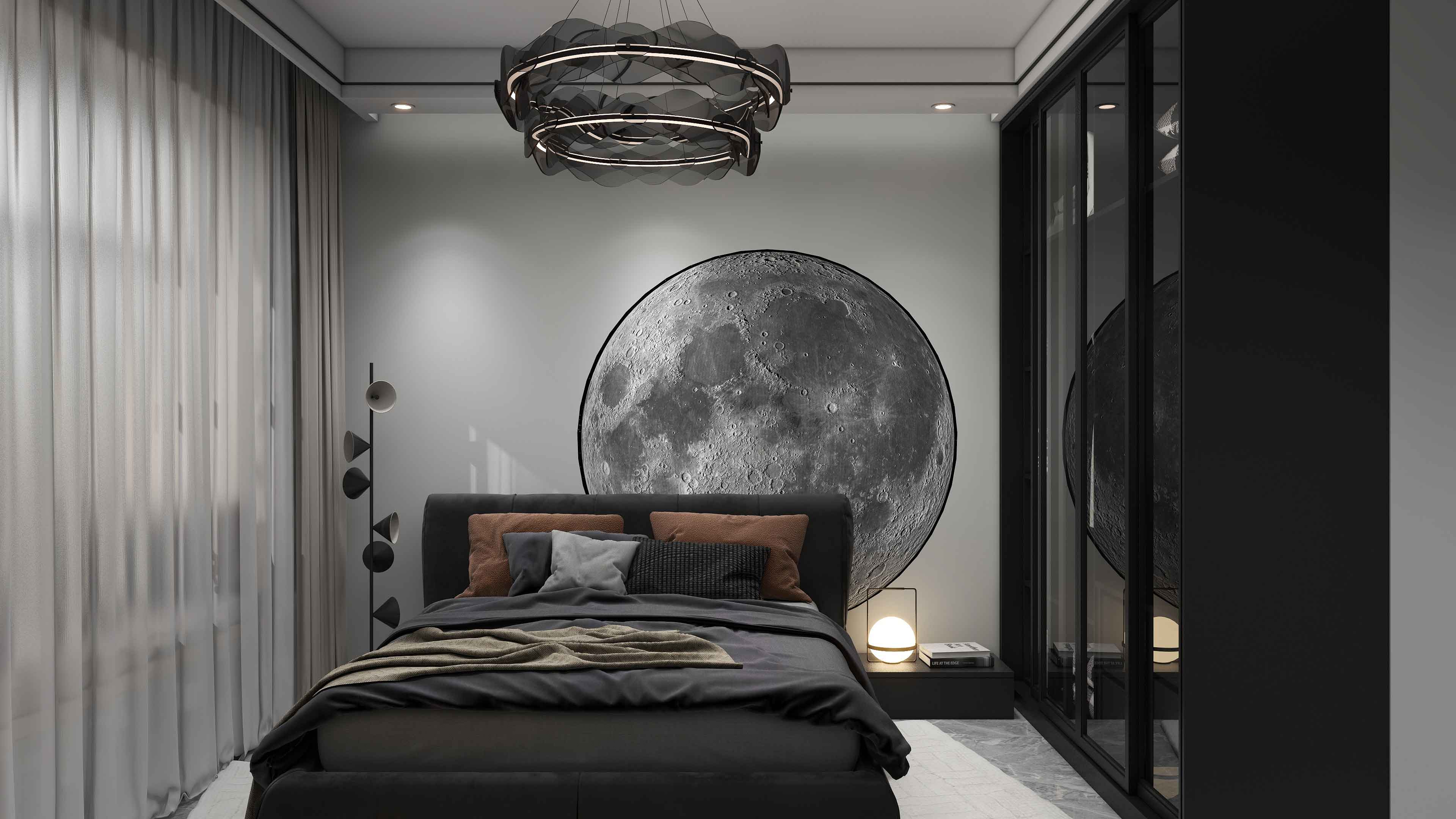 玻璃材质整体衣柜内置灯带更显高级,主卧从传统背景墙改为月球圆形墙饰,不再单一,个性十足,床头背景内嵌灯带洗墙,床头增加阅读灯同时可以作为小夜灯使用。