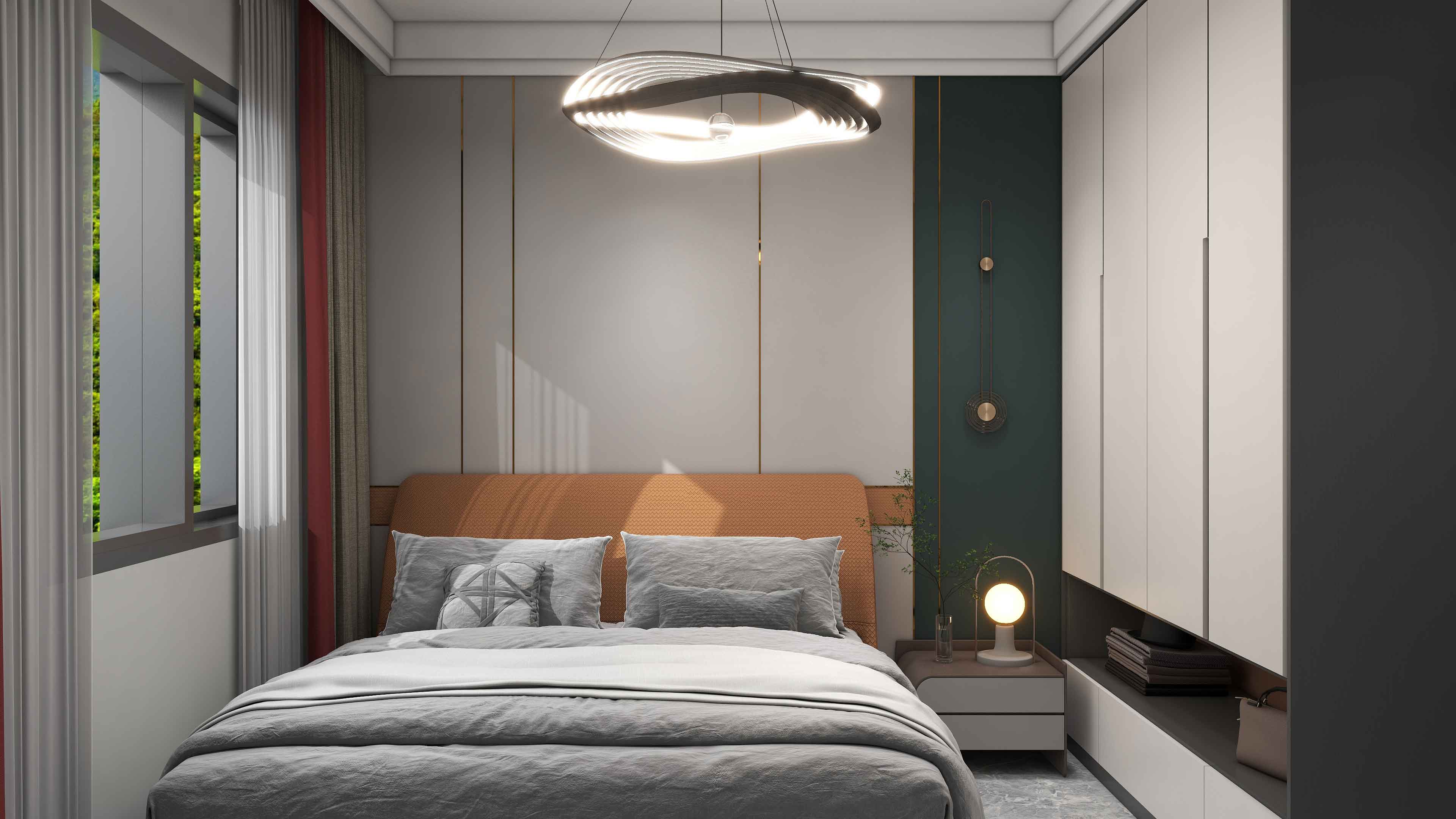 衣柜抬高分体,保证储物空间的基础上不影响开门,中空空间可以放置书籍,玩偶更加多样性,床头背景墙与床头橘色相呼应,大胆活泼。